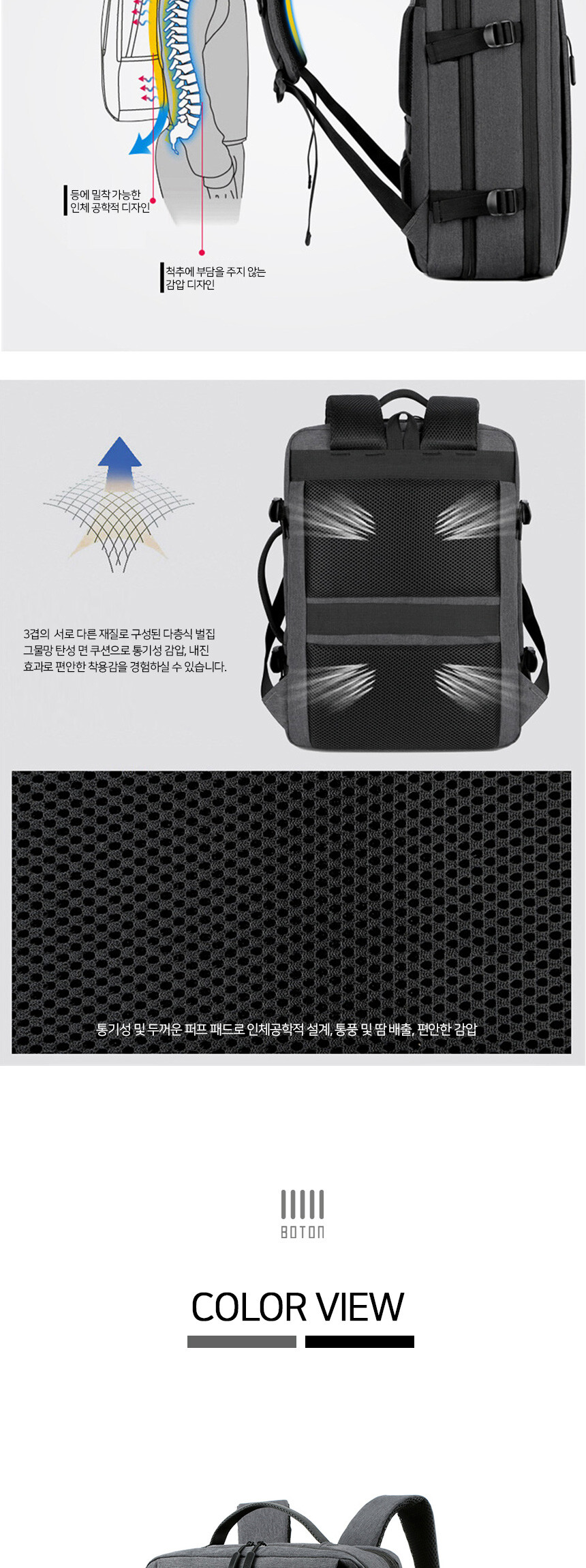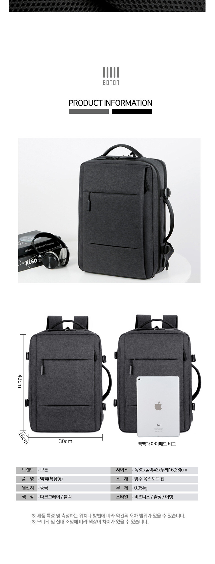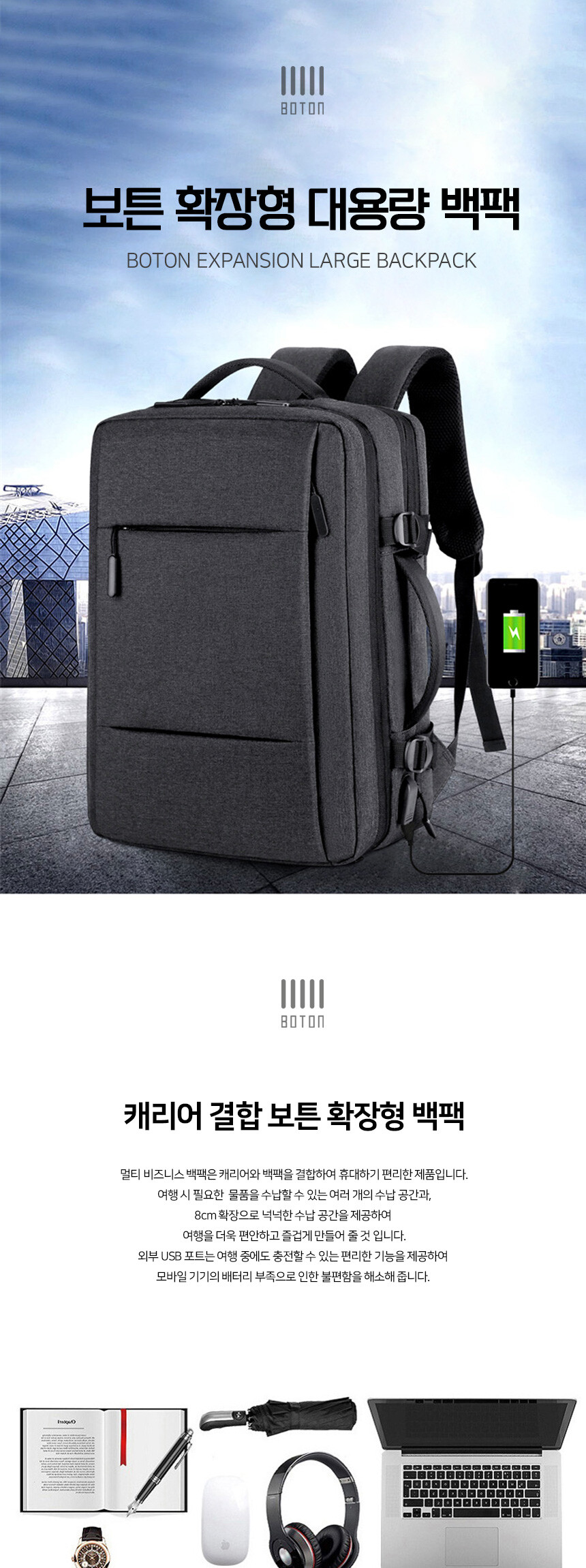 보튼 확장형 대용량 여행용 캐쥬얼 백팩 BP71